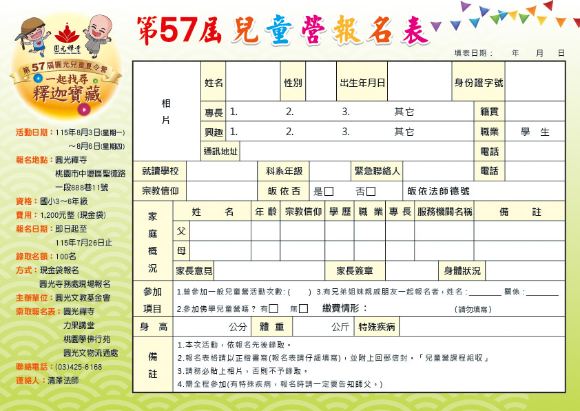 索取報名表:圓光禪寺 (及圓光文物流通處、桃園學佛行苑、力果講堂)